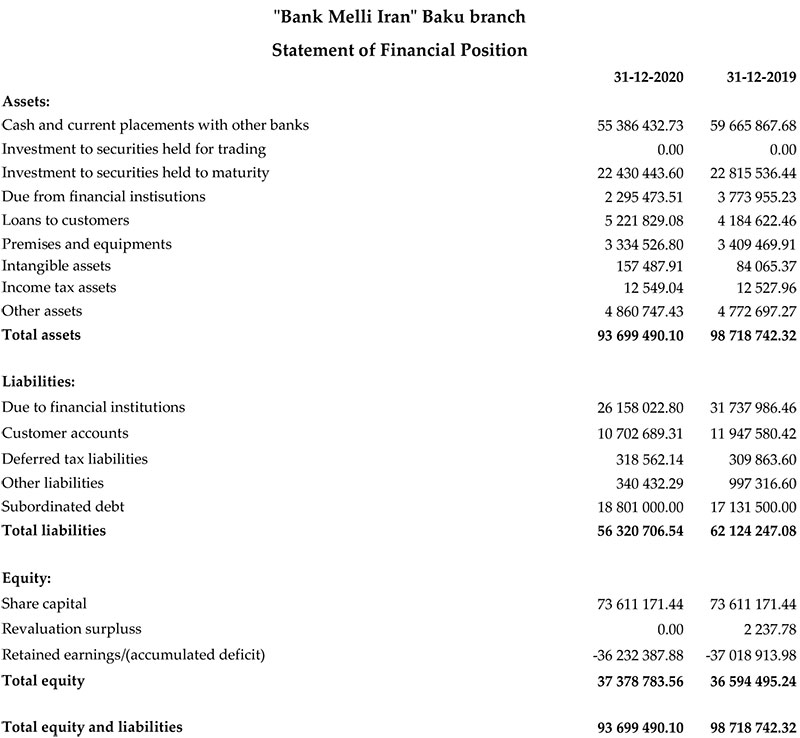 "Bank Melli İran" Bakı filialı 2020-ci ili 784 min 288 manat xalis mənfəət ilə başa vurub. Halbuki, Bank 2019-cu ili 16 milyon 555 min 647 manat xalis zərər ilə bağlamışdı.