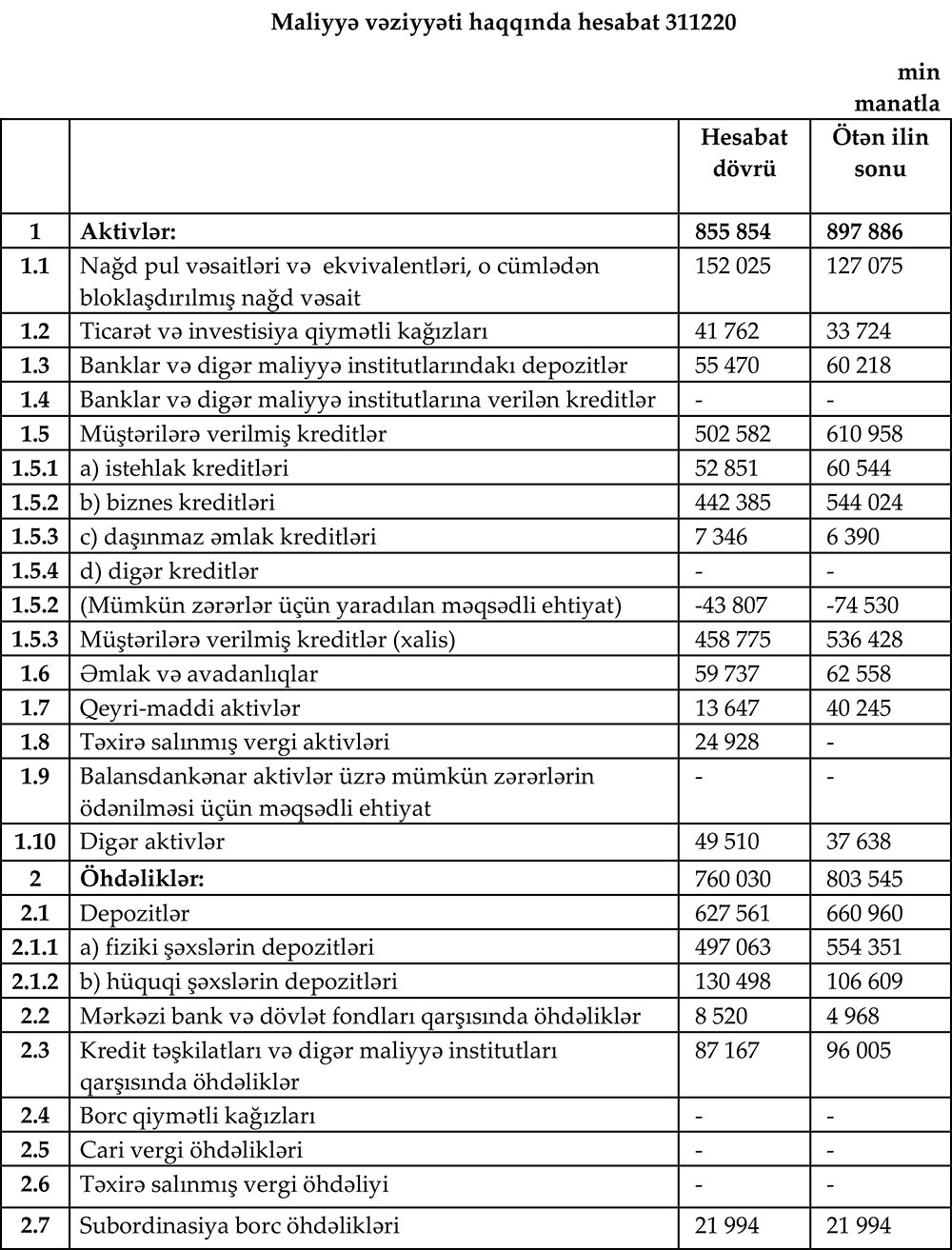 2019-cu ilin sonunda 660 milyon 960 min manata çatmış cəmi depozitlər 2020-ci ilin sonunda 627 milyon 561 min manat olub. Ötən il fiziki şəxslərin cəmi depozitləri 57 milyon 288 min manata azalaraq 497 milyon 063 min manata geriləyib, hüquqi şəxslərin depoitləri isə 23 milyon 889 min manat artaraq 130 milyon 498 min manata yüksəlib.
