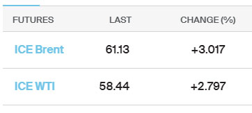Bakı vaxtı ilə saat 07:40-da Brent nefti 3% bahalaşma ilə 61.13 dollardan ticarət olunub. ABŞ xam nefti (WTI) isə 2,8% bahalaşma ilə 58.44 dollardan alıcı tapıb.