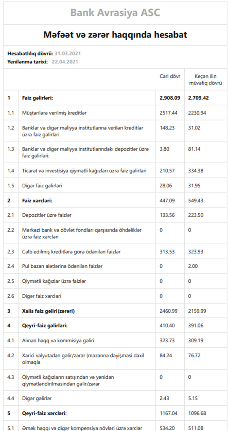 Müqayisə üçün qeyd edək ki, 2020-ci ilin yanvar-mart dövründə “Bank Avrasiya”nın cəmi əməliyyat gəlirləri 3 milyon 100 min manat, cəmi əməliyyat xərcləri 1 milyon 646 min manat, əməliyyat mənfəəti 1 milyon 454 min manat təşkil etmişdi. Bank əməliyyat mənfəətindən 1 milyon 309 min manat mümkün zərərlər üçün yaradılan məqsədli ehtiyatlara ayırdığından ötən ilin ilk rübünü 145 min manat xalis mənfəət ilə bağlamışdı.