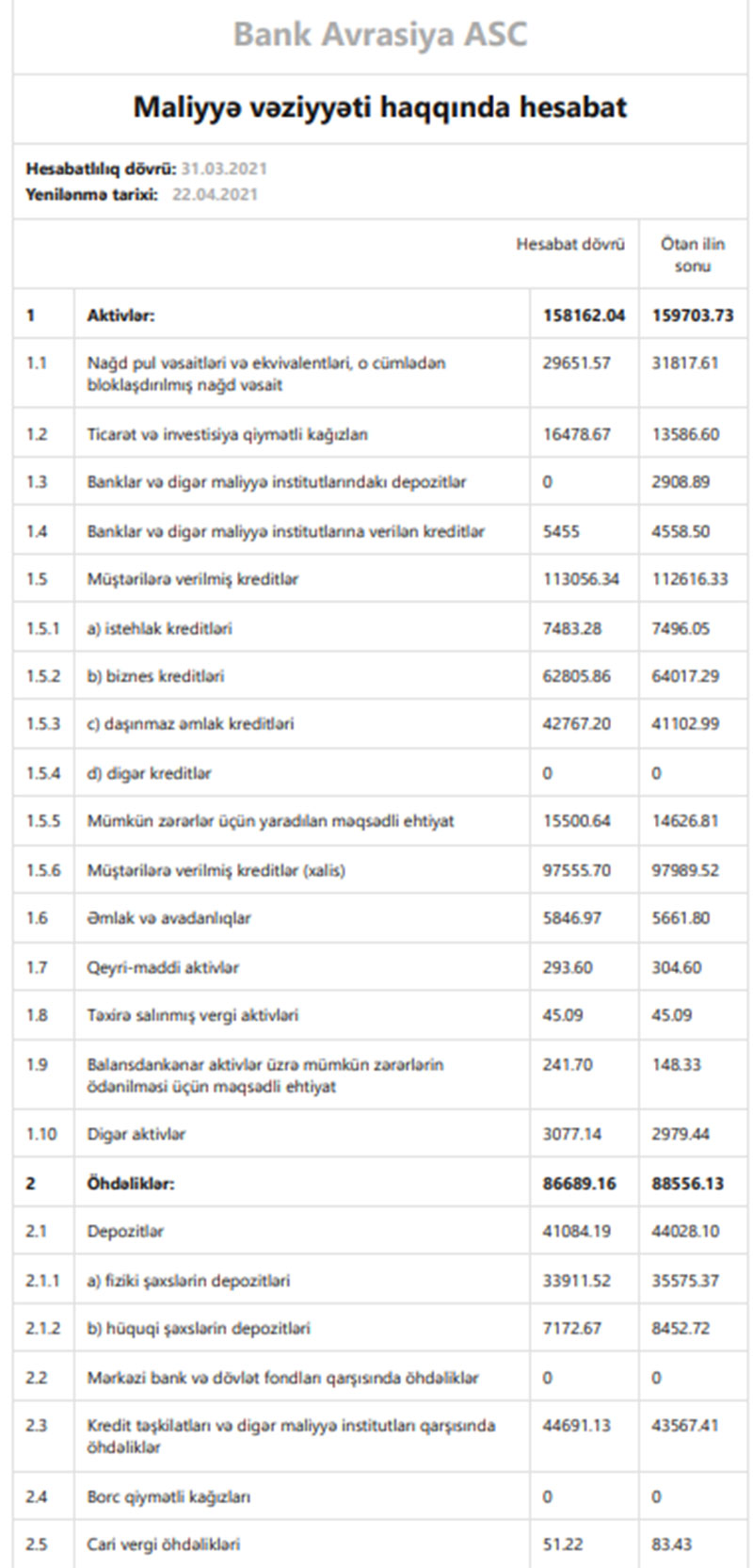 31 Mart 2021-ci il tarixində "Bank Avrasiya" 158 milyon 162 min manat cəmi aktivlərə, o cümlədən 113 milyon 56 min manat kredit portfelinə (müştərilərə verilmiş kreditlər) malik olub. Bank ötən ilin sonunda 159 milyon 703 min manat cəmi aktivlərə, o cümlədən 112 milyon 616 min manat kredit portfelinə malik idi.