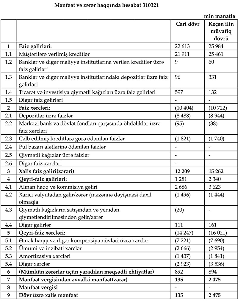 Müqayisə üçün qeyd edək ki, 2020-ci ilin ilk rübündə “AccessBank”ın cəmi əməliyyat gəlirləri 28 milyon 324 min manat, cəmi əməliyyat xərcləri 26 milyon 743 min maant, əməliyyat mənfəəti 1 milyon 581 min manat təşkil etmişdi. Eyni zamanda, mümkün zərərlər üçün yaradılan məqsədli ehtiyatlardan azad olmuş 894 min manat hesabına mənfəət 2 milyon 475 min manata yüksəlmişdi.