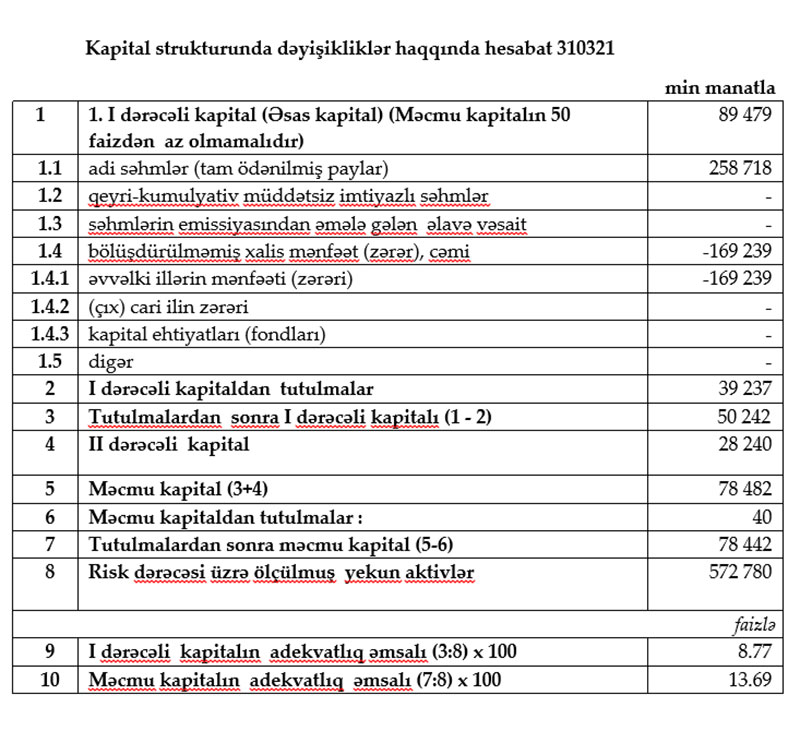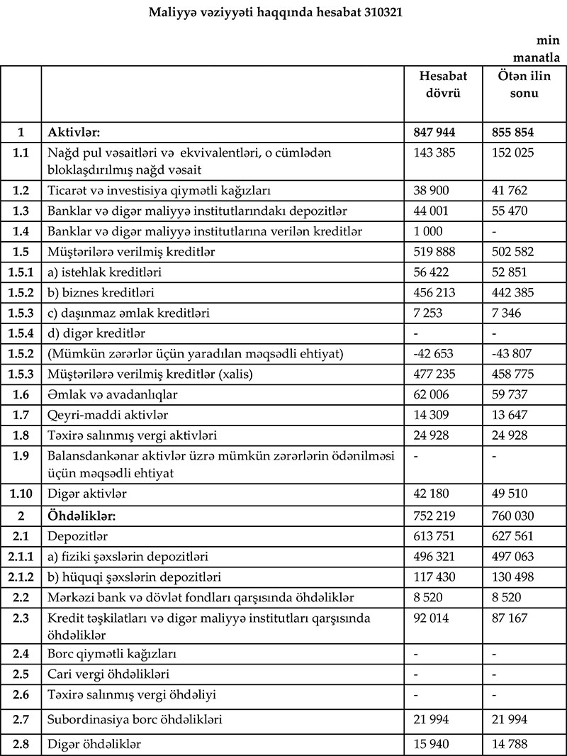 İlk rübdə Bankın xalis kredit portfeli (mümkün zərərlər üçün yaradılan məqsədli ehtiyat xaric kreditlər) 18 milyon 460 min manat artaraq 477 milyon 235 min manata çatıb.