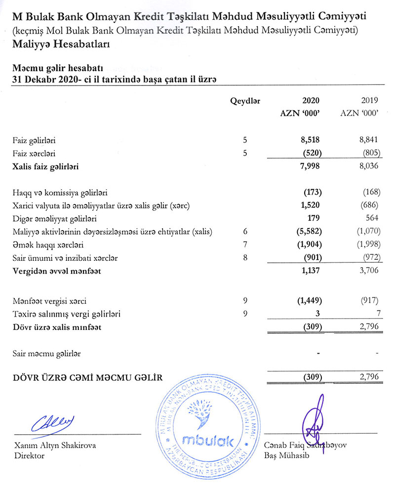 “M Bulak” Bank Olmayan Kredit Təşkilatı MMC (keçmiş “Mol Bulak” Bank Olmayan Kredit Təşkilatı) 2020-ci ili 309 min manat xalis zərər ilə başa vurub. Halbuki, təşkilat 2019-cu ili 2 milyon 796 min manat xalis mənfəət ilə bağlamışdı. Ehtiyatlara ayırmanın və ödənilən mənfəət vergisinin artması BOKT-ın zərərə düşməsinə səbəb olub.