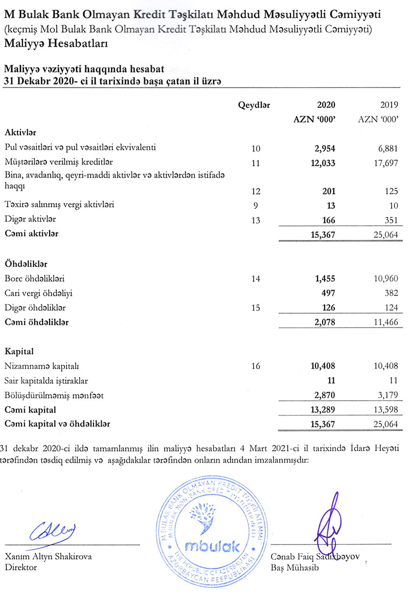 2019-cu illə müqayisədə 2020-ci ildə “M Bulak”ın cəmi aktivləri 25 milyon 64 min manatdan 15 milyoin 367 min manata, o cümlədən müştərilərə verilmiş cəmi kreditlər 17 milyon 697 min manatdan 12 milyon 33 min manata düşüb.