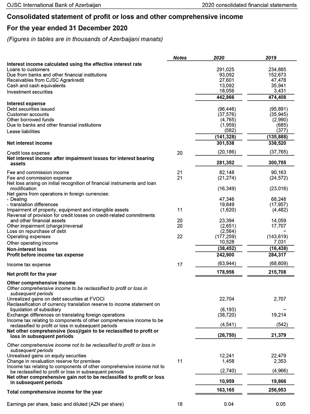 Ötən il müştərilərə verilmiş kreditlər üzrə faiz gəlirləri artsa da, əsas bankçılıq fəaliyyəti ilə birbaşa bağlı olmayan - banklara yerləşdirilmiş vəsaitlər və "Aqrarkredit" vekselləri üzrə faiz gəlirlərinin azalması, xərclərin, o cümlədən pandemiya ilə bağlı kreditlərə görə ayrılmış mümkün zərərin ödənilməsi üçün ehtiyat xərclərində artım xalis mənfəəti ötən ilə nisbətən azaldıb.