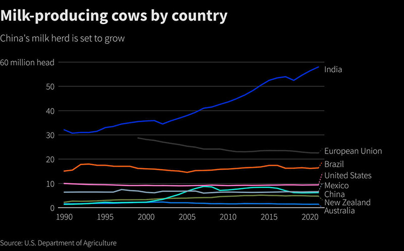 Proqnozlar növbəti iki ildə Çinin yerli maldarlıq təsərrüfatlarının 500 min baş inək təmin edəcəyini, ən azı 400 min başın da xaricdən idxal edilməli olduğunu bildirir. Təkcə ötən il Çinə Avstraliya və Yeni Zelandiyadan 200 min baş sağmal inək gətirilib.