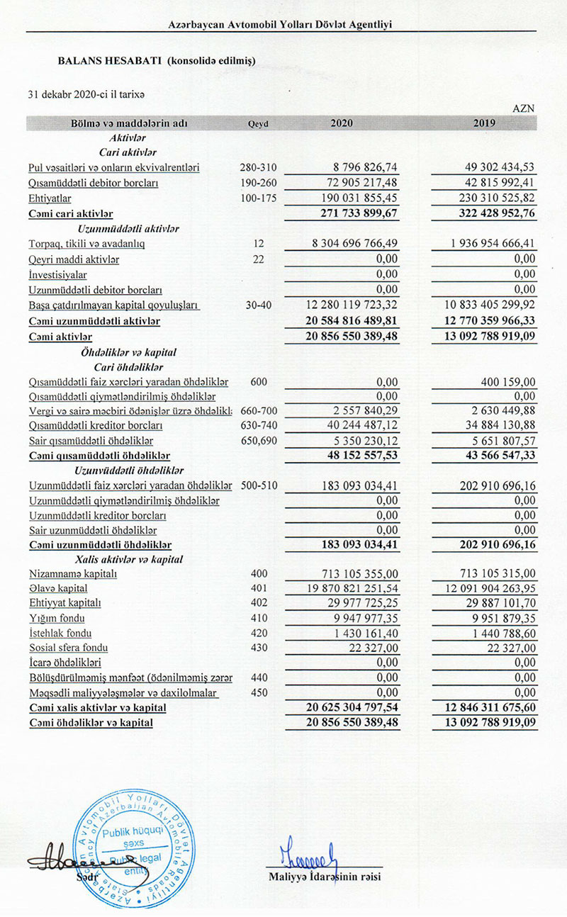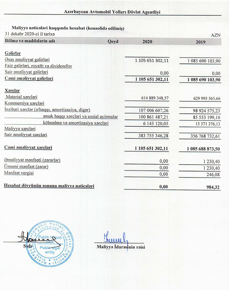 2020-ci ildə Azərbaycan Avtomobil Yolları Dövlət Agentliyinin gəlir və xərcləri eyni səviyyədə olub.2020-ci ildə Azərbaycan Avtomobil Yolları Dövlət Agentliyinin (AAYDA) gəlirləri 1 milyard 105 milyon 651 min manat, xərcləri də1 milyard 105 milyon 651 min manat təşkil edib. Agentlik ötən il mənfəət əldə etməyib.