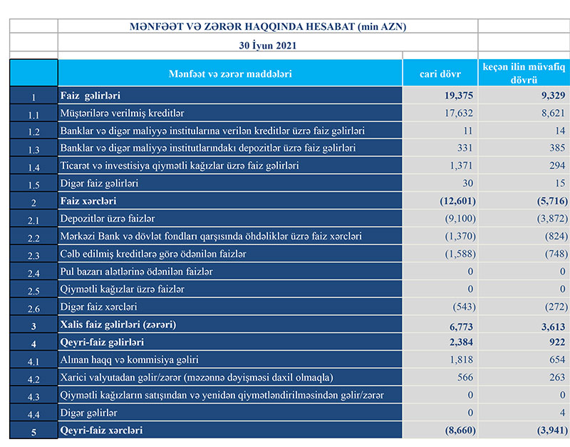 Müqayisə üçün qeyd edək ki, 2020-ci ilin yanvar - iyun dövründə “Turanbank”ın cəmi əməliyyat gəlirləri 10 milyon 251 min manat, cəmi əməliyyat xərcləri 9 milyon 657 min manat, əməliyyat mənfəəti 594 min manat təşkil etmişdi. O cümlədən, ehtiyatdan azad olmuş 51 min manat mənfəətə əlavə edildiyindən Bank həmin dövrü 645 min manat xalis mənfəət ilə bağlamışdı.