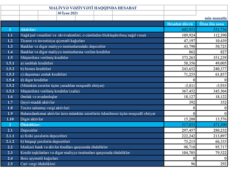 2020-ci ilin sonu ilə müqayisədə ilk 6 ayda "Turanbank"ın cəmi aktivləri 51 milyon 217 min manat aratraq 602 milyon 953 min manata, o cümlədən müştərilərə verilmiş kreditlər 22 milyon 24 min manat artaraq 373 milyon 263 min manata yüksəlib.