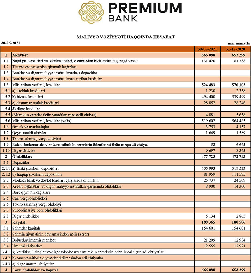 30 İyun 2021-ci il tarixində "Premium Bank"da depozitlər 437 milyon 952 min manat təşkil edib, bu da ötən ilin sonu ilə müqayisədə 6 milyon 834 min manat çoxdur. Artım fiziki şəxslərin depozitlərinin artmasının hesabınadır. Belə ki, hüquqi şəxslərin depozitləri 29 milyon 636 min manat azalaraq 81 milyon 959 min manata düşüb, fiziki şəxslərin depozitləri isə 36 milyon 470 min manat artaraq 355 milyon 993 min manata yüksəlib.