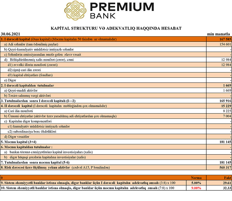 30 İyun 2021-ci il tarixində "Premium Bank" 181 milyon 145 min manat məcmu kapitala malik olub. Bank ötən ilin sonunda 17milyon 917 min manat məcmu kapitala malik idi. Məcmu kapitalın artması xalis mənfəətin hesabınadır.
