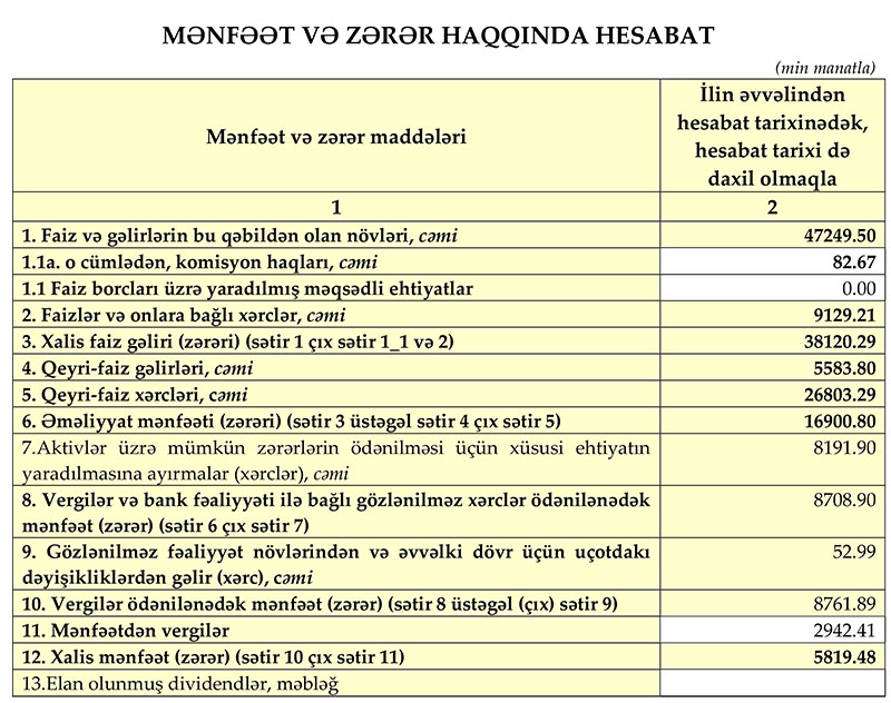 Müqayisə üçün qeyd edək ki, 2020-ci ilin yanvar-iyun dövründə “Xalq Bank”ın cəmi əməliyyat gəlirləri 69 milyon 13 min manat, əməliyyat xərcləri 37 milyon 877 min manat, gəlirlər xərcləri üstələdiyindən əməliyyat mənfəəti 31 milyon 136 min manat təşkil etmişdi. Bank əməliyyat mənfəətindən aktivlər üzrə mümkün zərərlərin ödənilməsi üçün xüsusi ehtiyatın yaradılmasına 9 milyon 967 min manat ayırma etdiyindən və 4 milyon 3 min manat mənfəət vergisi ödədiyindən həmin dövrü 17 milyon 179 min manat xalis mənfəət ilə bağlamışdı.