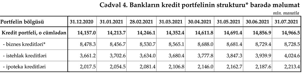 2021-ci ilin 7 ayı ərzində isə (tən ilin sonu ilə müqayisədə) bankların kredit portfeli 809,5 milyon manat artıb. 7 ayda istehlak kreditləri 363,4 milyon manat, ipoteka kreditləri 195,9 milyon manat, biznes kreditləri isə 250,2 milyon manat artıb.