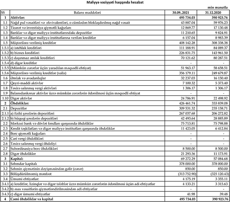 2020-ci ilin 9 ayını (yanvar-sentyabr dövrünü) 23 milyon 193 min manat xalis zərər ilə başa vurmuş “Yelo Bank” ASC, 2021-ci ilin 9 ayını 11 milyon 367 min manat xalis mənfəət ilə bağlayıb. Xalis mənfəətin böyük hissəsi ehtiyatdan azad olmuş vəsait ilə əlaqədardır.