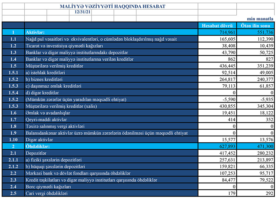 31 dekabr 2021-ci il tarixində 91 milyon 917 min manat manat məcmu kapitala malik olub. Bank 31 dekabr 2020-ci il tarixində 82 milyon 215 min manat cəmi kapitala malik idi.