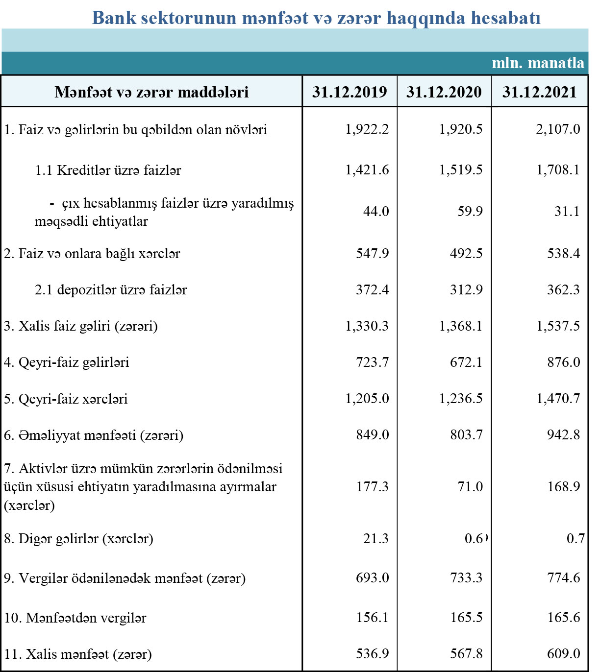 31 dekabr 2021-ci il tarixinə fəaliyyətdə olan bankların cəmi aktivləri 38 milyard 462.2 milyon manat, cəmi öhdəlikləri 33 milyard 492.9 milyon manat, balans kapitalı 4 milyard 969.3 milyon manat olmuşdur.