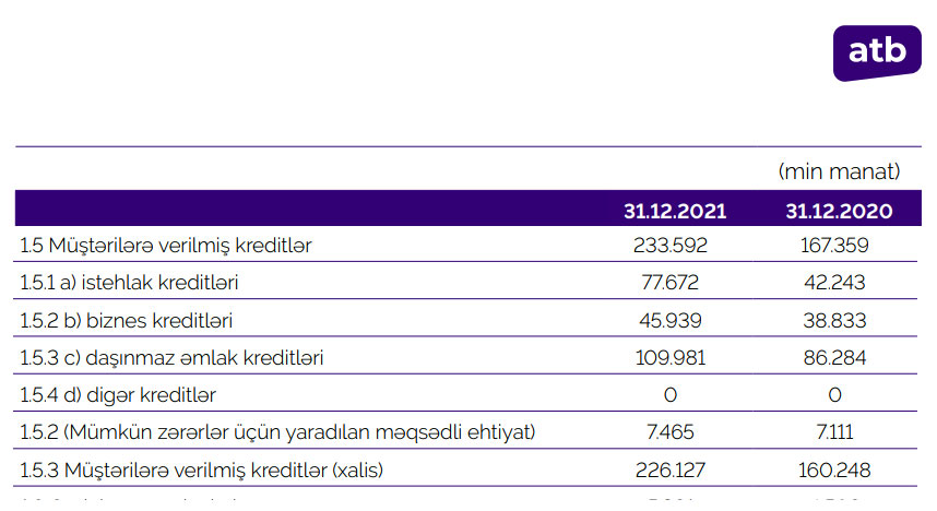 Dövlət bankı maliyyə göstəricilərini açıqladıÖtən il Bankın istehlak kreditləri portfeli 35 milyon 429 min manat artaraq 77 milyon 672 min manata, biznes kreditləri portfeli 7 milyon 106 min manat artaraq 45 milyon 939 min manata, daşınmaz əmlak (ipoteka) kreditləri portfeli isə 23 milyon 697 min manat artaraq 109 milyon 981 min manata yüksəlib.