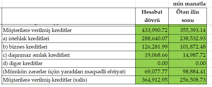 Marja.az xəbər verir ki, ilk 3 ayda Bankın istehlak kreditləri portfeli (əhaliyə verilən nağd pul kreditləri) 50 milyon 108 min manat artaraq 288 milyon 640 min manata, biznes kreditləri portfeli 24 milyon 410 min manat artaraq 126 miylon 282 min manata, ipoteka kreditləri portfeli 4 milyon 81 min manat artaraq 19 milyon 69 min manata çatıb.