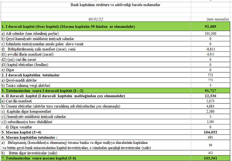 31 Mart 2022-ci il tarixində “Rabitəbank” 103 milyon 561 min manat məcmu kapitala malik olub.