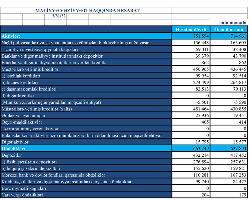 Məlumatda qeyd edilib ki, 2022-ci ilin I rübünün yekunlarına görə, TuranBank ASC-nin cəmi aktivləri ötən ilin analoji dövrü ilə müqayisədə 25,8% və ya 153,9 milyon manat artaraq 751,6 milyon manat, o cümlədən müştərilərə verilmiş kreditlər 28,3% və ya 100,9 milyon manat artaraq 457 milyon manat təşkil etmişdir. Daim etibarlılıq prinsiplərinə sadiq qalan TuranBank-ın depozitlərinin həcmində də artım müşahidə olunmuşdur. Belə ki, 2022-ci ilin I rübündə cəmi depozit portfeli keçən ilin müvafiq dövrü ilə müqayisədə 38,9% və ya 121,1 milyon artaraq 432,2 milyon manat, fiziki şəxslərin depozitləri isə 30,7% və ya 65 milyon manat artaraq 276,6 milyon manat təşkil etmişdir. Bank davamlı inkişaf üçün kifayət qədər yüksək kapital ehtiyatına malikdir. Belə ki, keçən ilin analoji dövrü ilə müqayisədə Bankın məcmu kapitalı 15.2% artaraq 94,9 milyon manat olmuşdur.