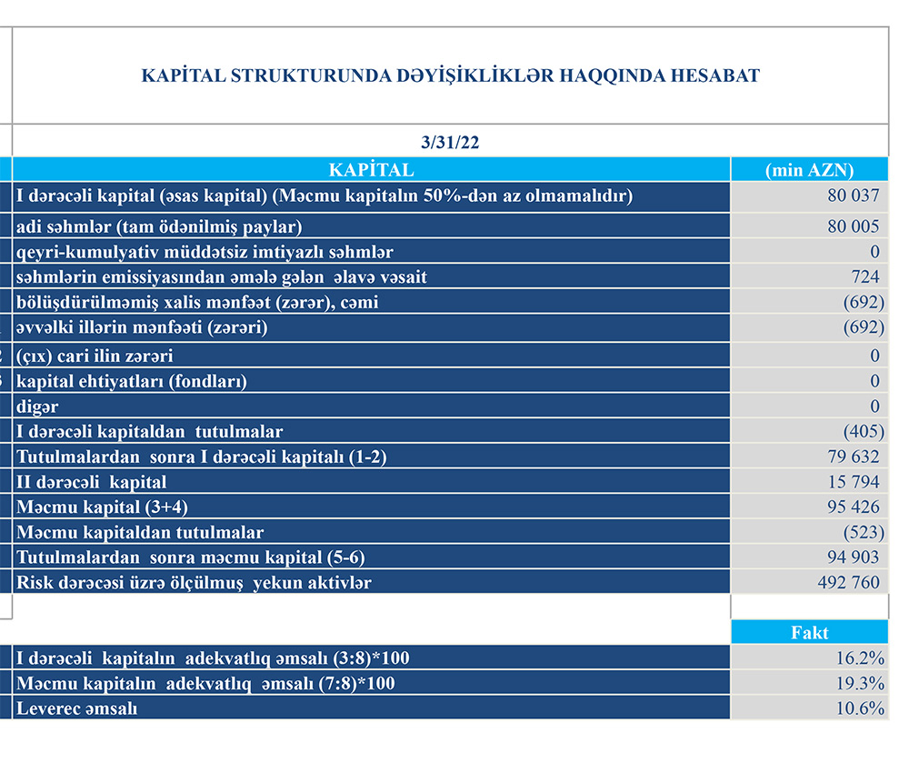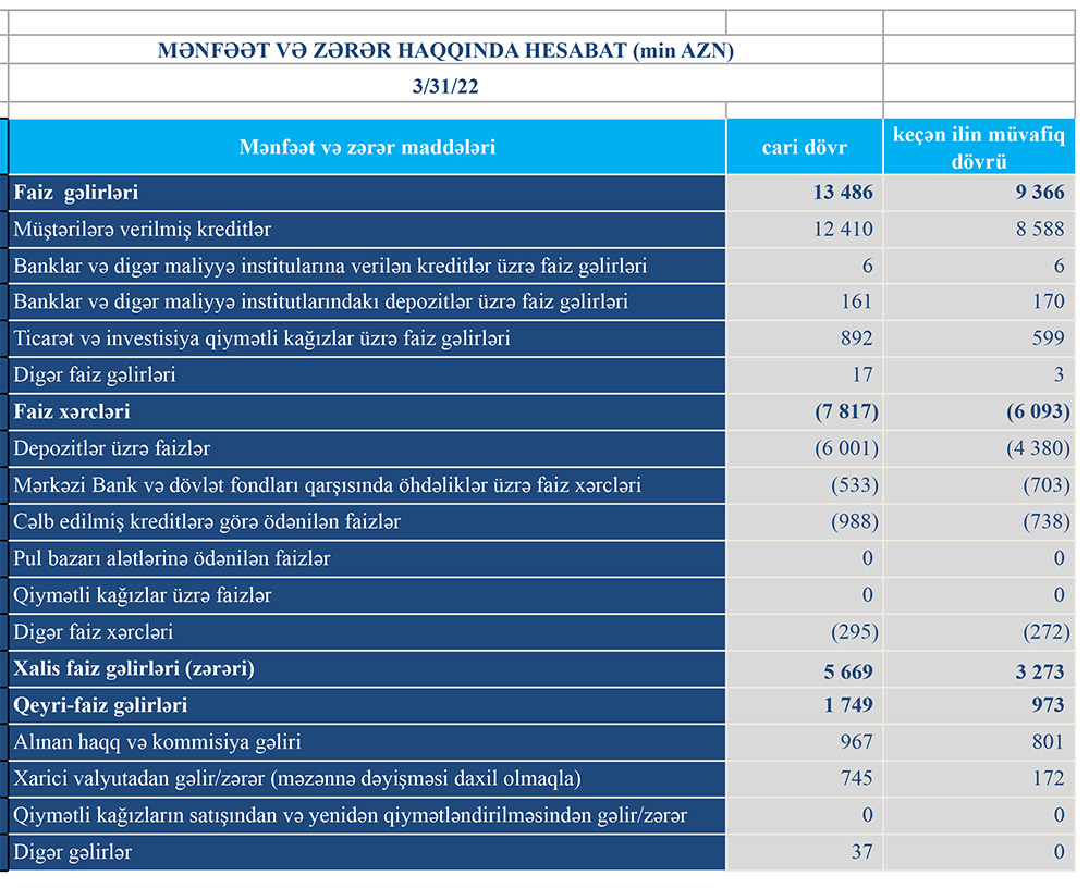 Bankın yaydığı press-relizdə bildirilir ki, real sektorun dəstəklənməsi istiqamətində aktiv fəaliyyətini davam etdirən Bank cari ilin 1-ci rübünü 1 milyon 13 min manat mənfəətlə başa vurmuşdur.