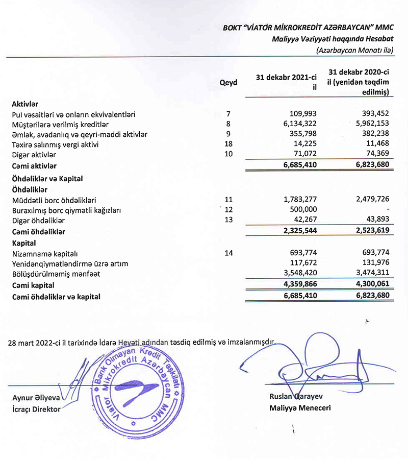 “Viator Mikrokredit Azərbaycan”ın kredit portfeli (müştərilərə verilmiş kreditlər) ötən il təxminən 3% artaraq 6 milyon 734 min manata çatıb.