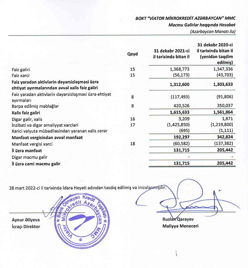 Marja.az xəbər verir ki, “Viator Mikrokredit Azərbaycan”ın faiz gəlirləri 2020-ci ildə 1 milyon 347 min manat ikən, 2021-ci ildə 1 milyon 369 min manat təşkil edib. Ehtiyatın yaradılması üzrə, inzibati və digər xərclərinin artması ilə əlaqədar olaraq BOKT-un xalis mənfəəti düşüb.
