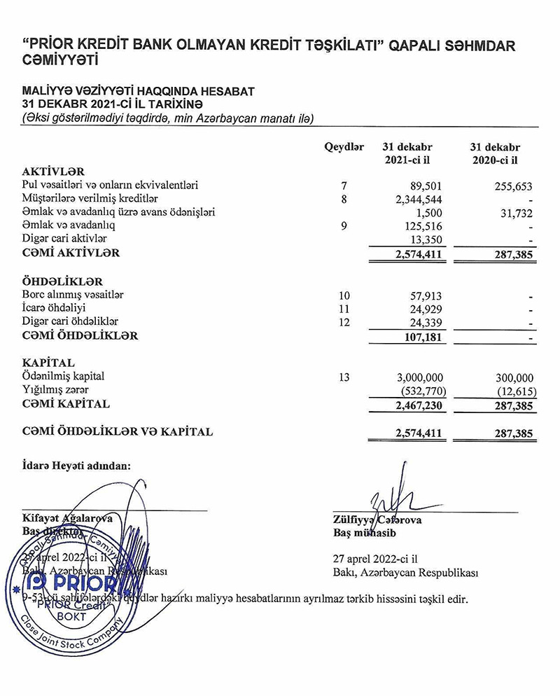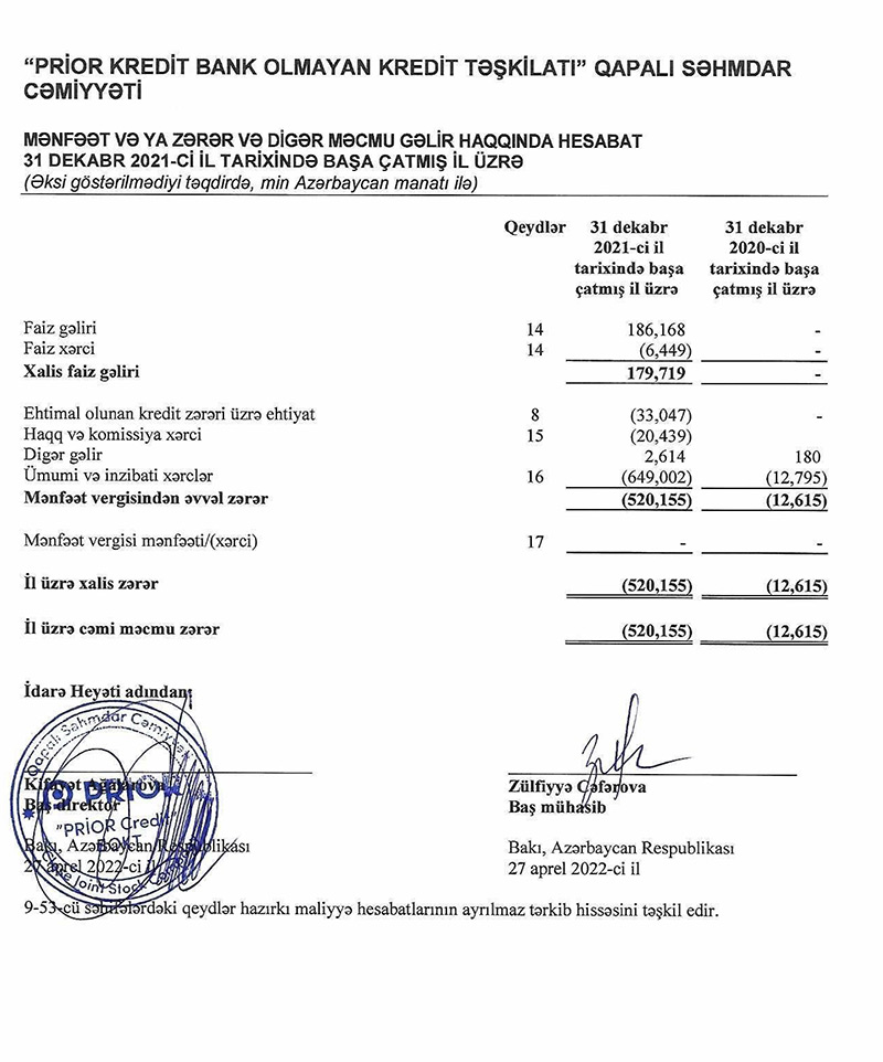 Faktiki olaraq 2021-ci ildə aktiv fəaliyyətə başlamış "Prior Kredit Bank Olmayan Kredit Təşkilatı" QSC 2021-ci ili 520 min manat xalis zərər ilə başa vurub. Şirkət 2020-ci ili 13 min manat xalis zərər ilə bağlamışdı. Beləliklə, 2020-ci illə müqayisədə 2021-ci ildə "Prior Kredit"in xalis zərəri 40 dəfə artıb. Zərərin əsas səbəbi gəlirləri üstələyən xərclərdir.