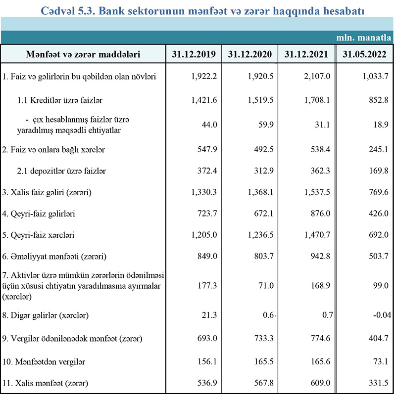 Azərbaycanın bank sektoru 2022-ci ilin ilk 5 ayını 331,5 milyon manat xalis mənfəət ilə başa vurub. Ötən ilin eyni dövrü ilə müqayisədə sektorun xalis mənfəəti 58,3 milyon manat və ya 21,3% artıb.Bank sektoru 2021-ci ilin ilk 5 ayını 273,2 milyon manat xalis mənfəət ilə bağlamışdı.