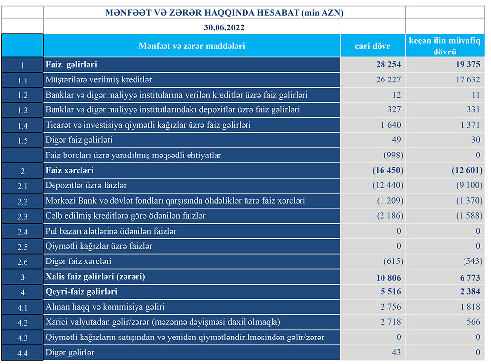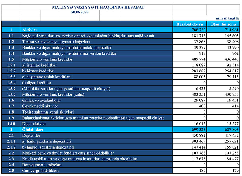 2021-ci ilin sonu ilə müqayisədə "Turanbank" ASC-nin cəmi aktivləri 73 milyon 771 min manat və ya 10,3% artaraq 30 iyun 2022-ci il tarixində 788 milyon 732 min manata çatıb. Bank tərəfindən müştərilərə verilmiş kreditlər isə 53 milyon 329 min manat və ya 12,2% artaraq 489 milyon 774 min manata yüksəlib.
