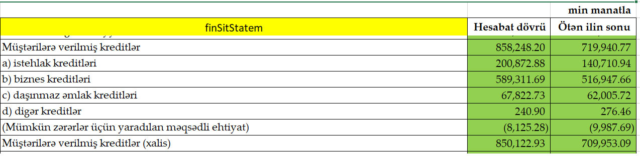 Marja xəbər verir ki, Bankın istehlak kreditləri porfeli 60 milyon 162 min manat artaraq 200 milyon 873 min manata, biznes kreditləri portfeli 72 milyon 364 min manat və ya 14% artaraq 589 milyon 312 min manata, ipoteka kreditləri portfeli isə 5 milyon 817 min manat və ya 9,4% artaraq 67 milyon 823 min manata çatıb.