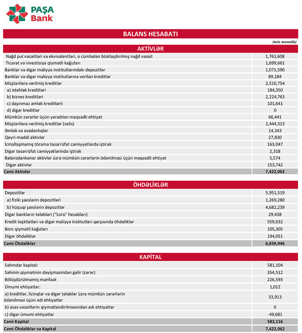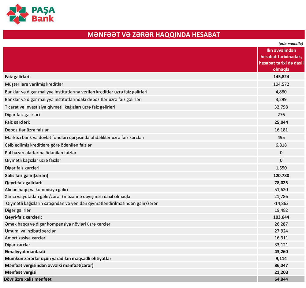 Müqayisə üçün qeyd edək ki, 2021-ci ilin birinci yarısında “PAŞA Bank”ın cəmi əməliyyat gəlirləri 188 milyon 833 min manat, cəmi əməliyyat xərcləri 102 milyon 213 min manat, əməliyyat mənfəəti 86 milyon 621 min manat, mümkün zərərlər üçün yaradılan məqsədli ehtiyatlara ayırması 24 milyon 473 min manat, ödənilmiş mənfəət vergisi 11 milyon 507 min manat təşkil etmişdi.