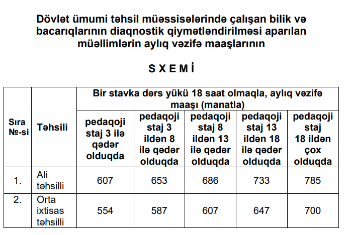 Müəllimlərinin bilik və bacarıqlarının diaqnostik qiymətləndirilməsi aparılan dövlət ümumi təhsil müəssisələrinin direktorlarının aylıq vəzifə maaşı 799 manat, direktorun müavinlərinin aylıq vəzifə maaşı 719 manat müəyyən edilmişdi.