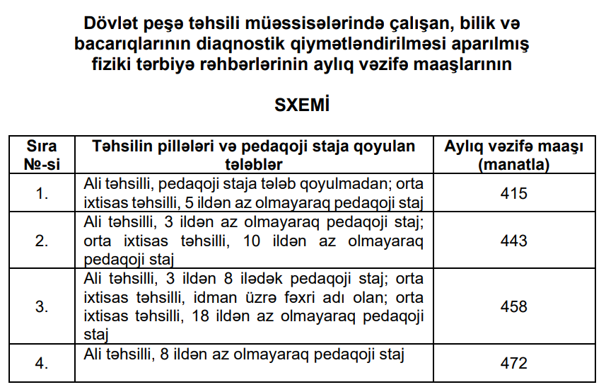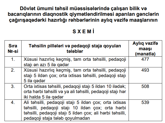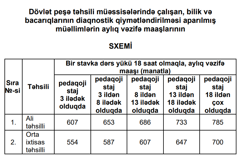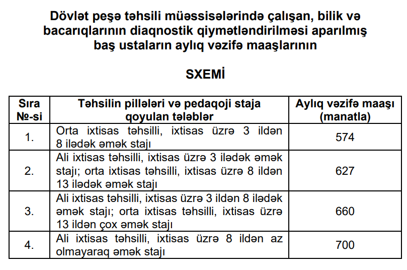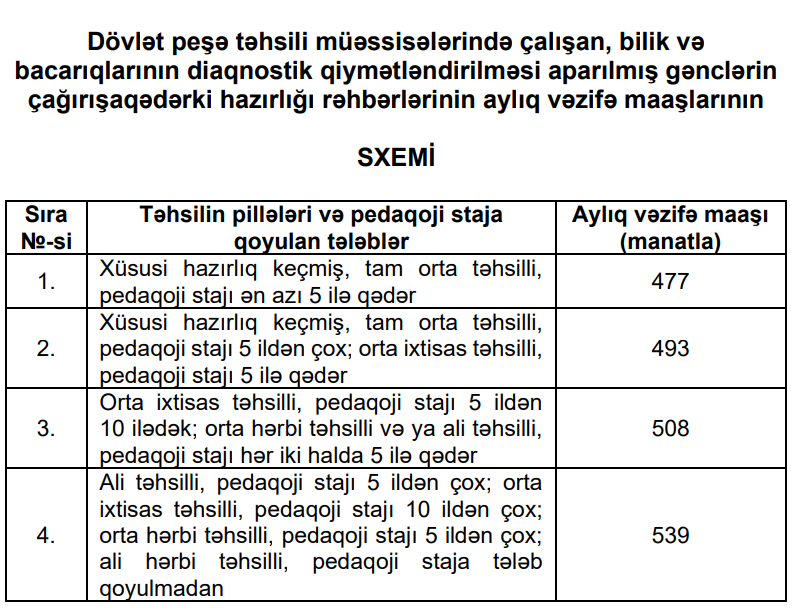Qərara əsasən, müəllimlərinin bilik və bacarıqlarının diaqnostik qiymətləndirilməsi aparılmış dövlət peşə təhsili müəssisələrinin direktorlarının aylıq vəzifə maaşı 871 manat, direktorun müavinlərinin, baş mühasiblərinin aylıq vəzifə maaşı 785 manat və dərs hissə müdirlərinin aylıq vəzifə maaşı 700 manat müəyyən edilib.