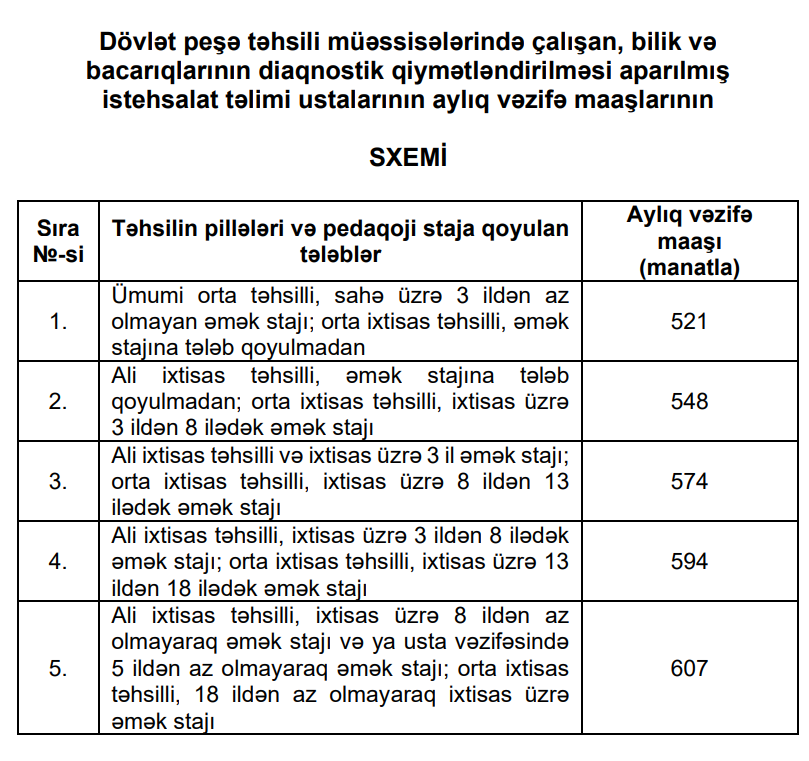 Bilik və bacarıqlarının diaqnostik qiymətləndirilməsi aparılmış dövlət peşə təhsili müəssisələrində idarəetmə, təhsil və təlim fəaliyyəti ilə məşğul olan işçilərin aylıq vəzifə maaşları sxemi və məbləğləri dəyişib.
