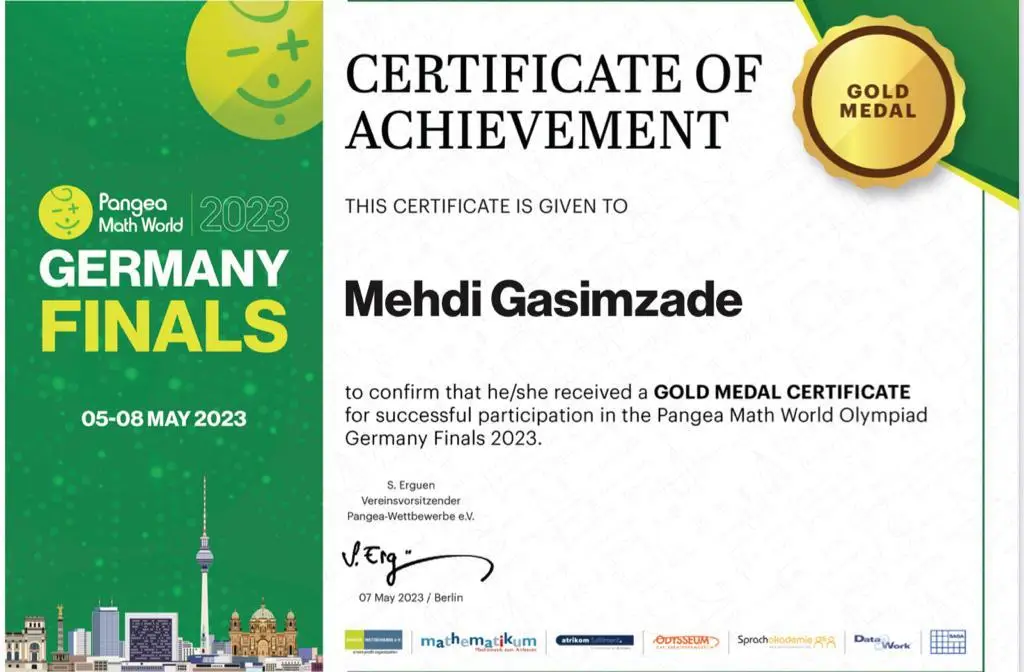 Məlumat üçün onu da bildirək ki, Mehdi Qasımzadə 2023-cü ilin 5-8 may tarixlərində Almaniyanın paytaxtı Berlin şəhərində keçirilmiş “Pangea math world” beynəlxalq riyaziyyat olimpiadasının qalibi olub.