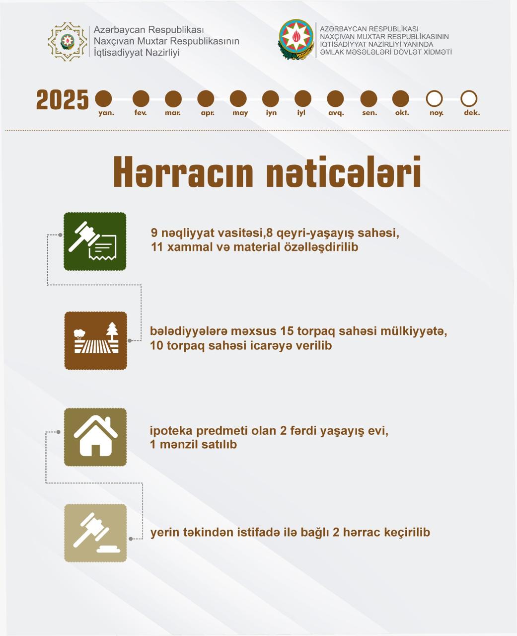 Bu ilin yanvar–oktyabr ayları ərzində Naxçıvan Muxtar Respublikasında dövlət əmlakının özəlləşdirilməsi, bələdiyyə mülkiyyətində olan torpaq sahələrinin mülkiyyətə və icarəyə verilməsi, ipoteka predmeti olan əmlakın satışı və yerin təkindən istifadə ilə bağlı ümumilikdə 58 hərrac təşkil olunub.