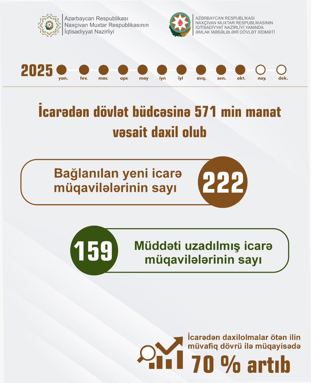 Bu göstərici 2024-cü ilin eyni dövrü ilə müqayisədə icarəyə verilmiş dövlət əmlakları üzrə daxilolmalarda 70 faiz artım deməkdir.