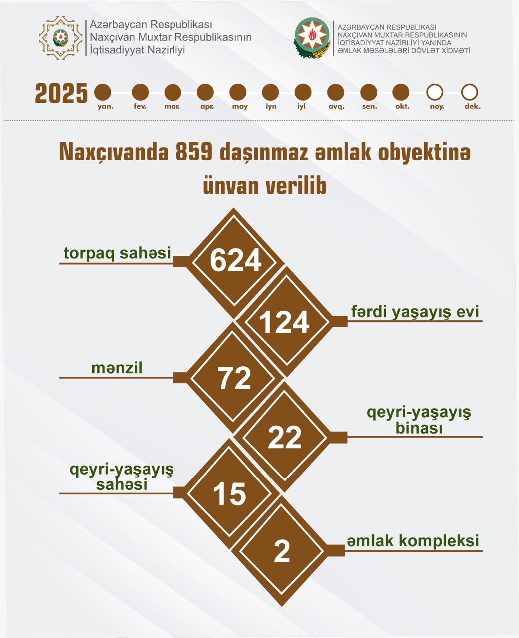2025-ci ilin yanvar-oktyabr ayları ərzində Naxçıvan Muxtar Respublikasının İqtisadiyyat Nazirliyi yanında Əmlak Məsələləri Dövlət Xidməti tərəfindən 8635 daşınmaz əmlak üzərində mülkiyyət hüququnun qeydiyyatı aparılıb.