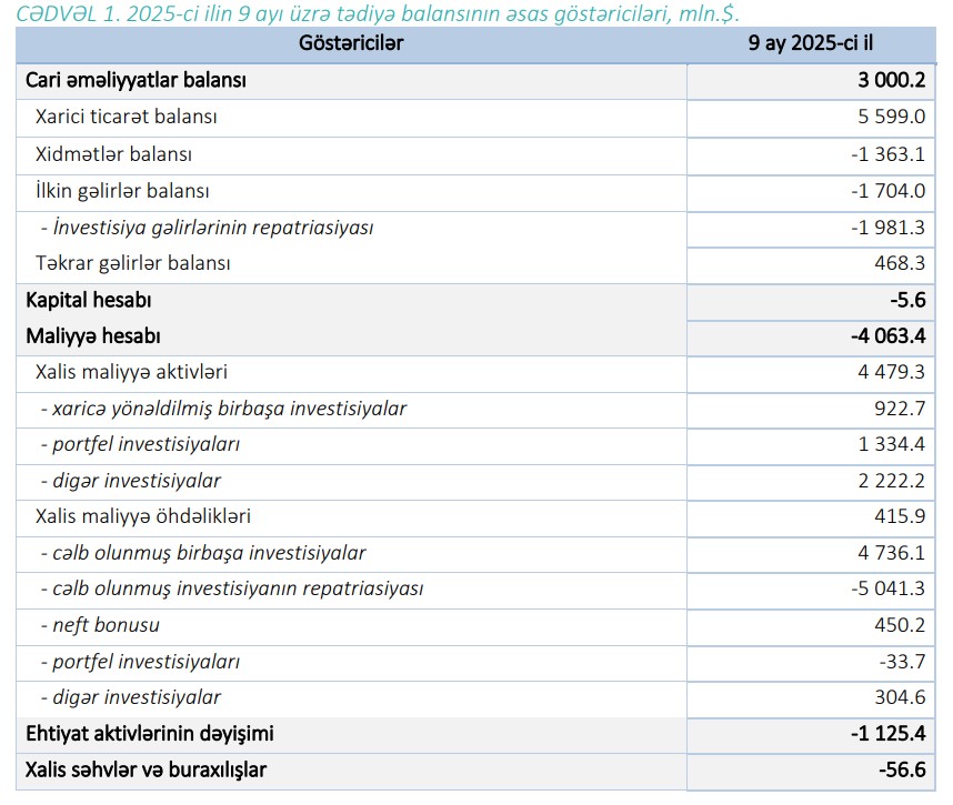 2025-ci ilin 9 ayında Azərbaycanın tədiyyə balansında 1 milyard 125,4 milyon dollar kəsir olub. 2024-cü ilin 9 ayı üzrə tədiyə balansında 181,6 milyon dollar profisit olmuşdu.2025-ci ilin 9 ayında tədiyə balansı qlobal əmtəə, xidmət və maliyyə bazarlarındakı qiymət və indekslərin dəyişkənliyindən təsirlənmişdir. Bu dövrdə cari əməliyyatlar balansında 3.0 mlrd.$ həcmində profisit formalaşmış, kapital və maliyyənin hərəkəti balansı üzrə xalis xarici maliyyə aktivləri 4.5 mlrd.$, xalis maliyyə öhdəlikləri isə 0.4 mlrd.$ artmışdır.