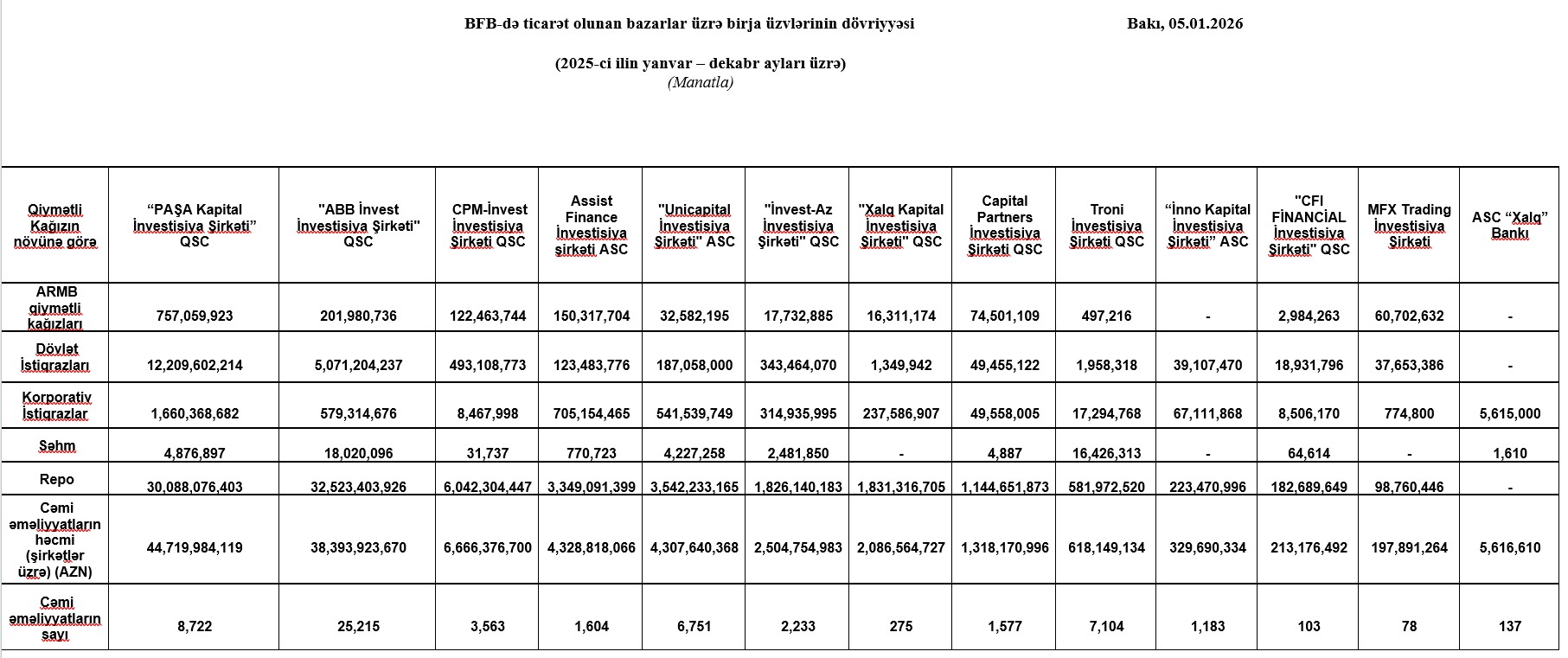 2025-ci ilin yanvar – dekabr ayları üzrə Bakı Fond Birjasında (BFB)ə ticarət olunan bazarlar üzrə birja üzvlərinin dövriyyəsi açıqlanıb.