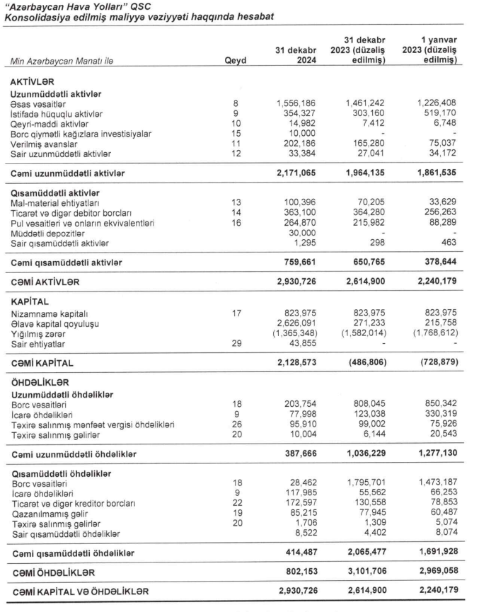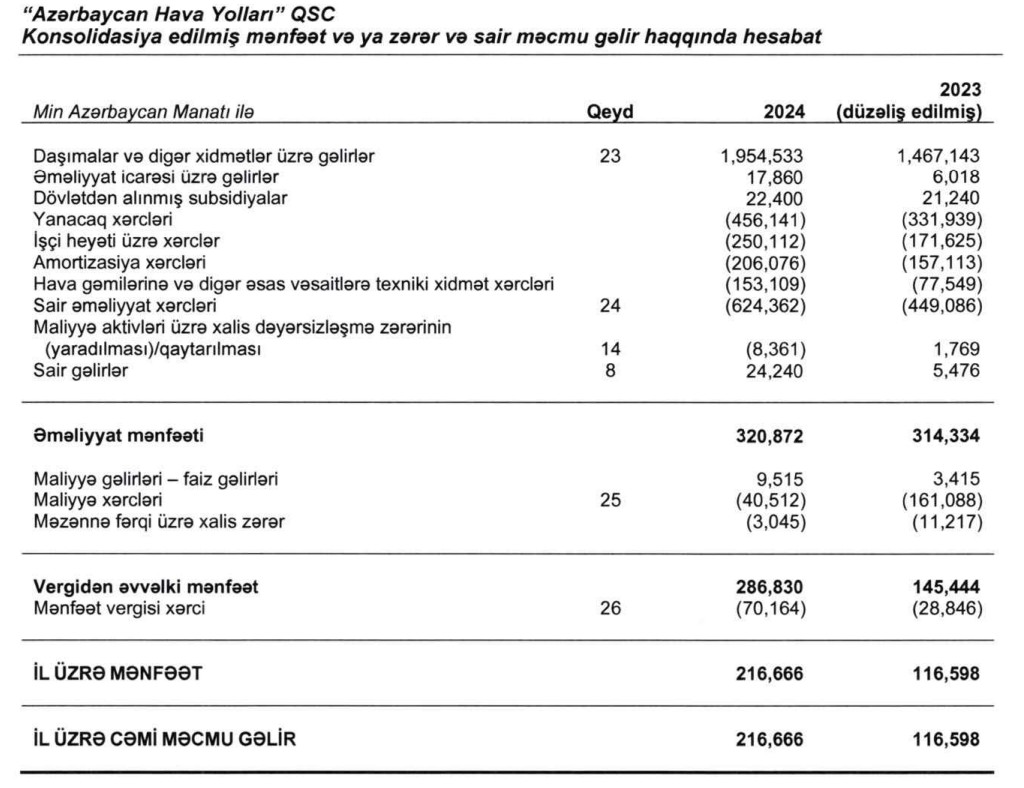 Quru sərhədlərin bağlı olması və uçuş coğrafiyasının genişləndirilməsi "Azərbaycan Hava Yolları" QSC-nin (AZAL) maliyyə göstəricilərinə müsbət göstərib. AZAL 2024-cü ili 216 milyon 666 min manat xalis mənfəət ilə başa vurub. Halbuki, Şirkət 2023-cü ili 116 milyon 598 min manat xalis mənfəət ilə bağlamışdı. Beləliklə, AZAL-ın xalis mənfəəti 2024-cü ildə 2023-cü illə müqayisədə 100 milyon 68 min manat və ya 85,8% artıb. Əməliyyat icarəsi üzrə gəlirlərin, sair gəlirlərin, maliyyə gəlirlərinin (faiz gəlirlərinin) artması və maliyyə xərclərinin kəskin azalması hesabına dövlət şirkətinin xalis mənfəətində artım baş verib.