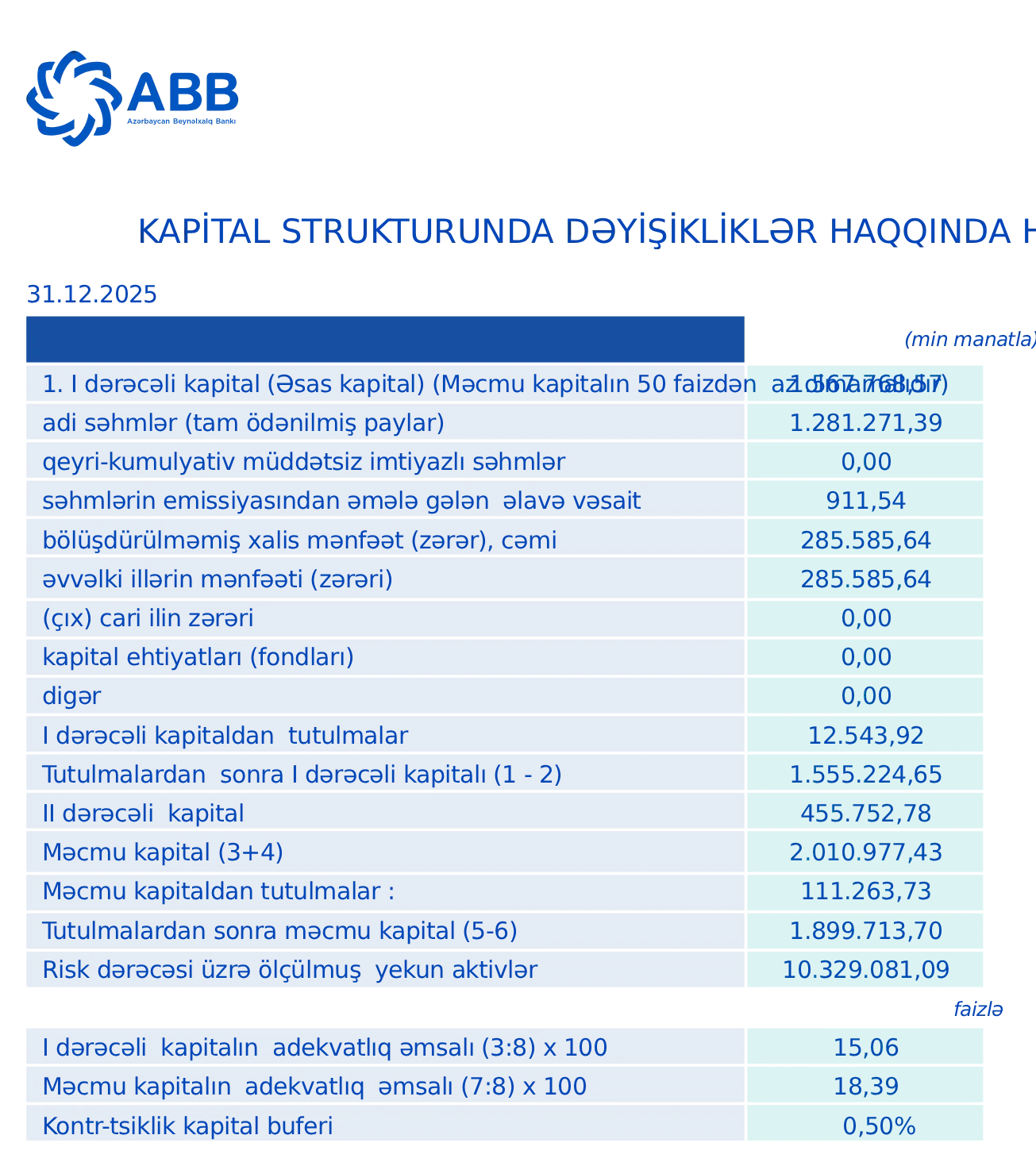Eyni zamanda, ABB-nin məcmu kapitalı 2025-ci ilin sonunda 1 milyard 899 milyon 714 min manata yüksəlib. 2024-cü ilin sonunda məcmu kapital 1 milyard 743 milyon 839 min manat idi. Kapital 155 milyon 875 min manat və ya 8,9% artıb, bu da bankın maliyyə dayanıqlılığının və risklərə davamlılığının gücləndiyini göstərir.