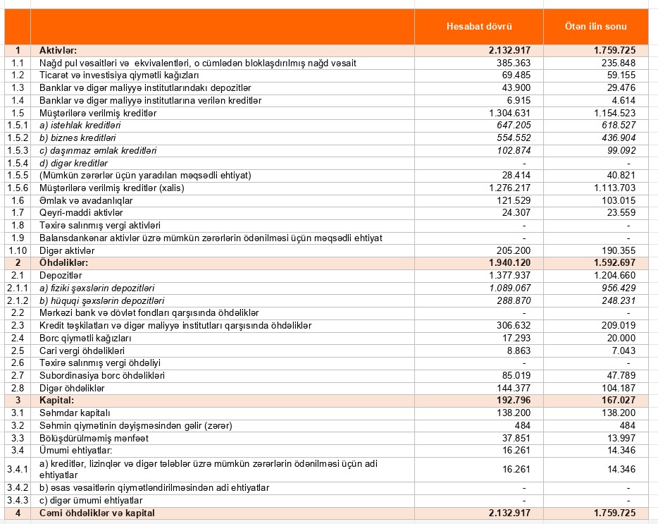 - hüquqi şəxslərin depozitləri 288 milyon 870 min manata yüksəlib (2024: 248 milyon 231 min manat), artım 40 milyon 639 min manat və ya 16,4 faiz təşkil edib.
