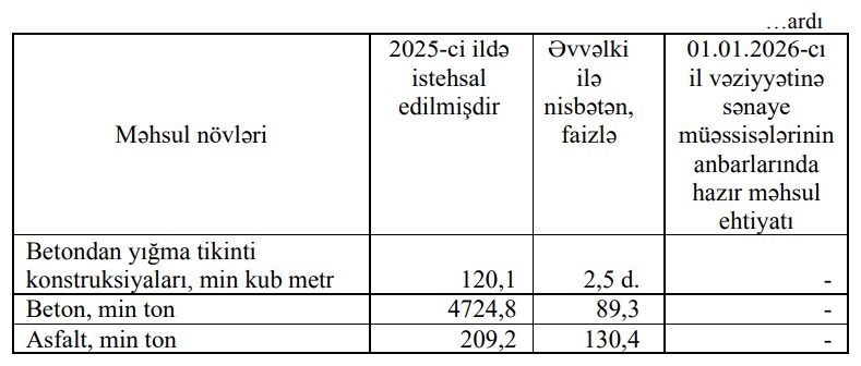 Tikinti materiallarının istehsalı sahəsində 2025-сi ildə istehsalın ümumi dəyəri 1462,3 milyon manat olmaqla, əvvəlki illə müqayisədə 4,3 faiz azalmışdır. Dövr ərzində beton istehsalı 10,7 faiz, sementdən, betondan kərpiclər və oxşar məmulatların istehsalı 12,4 faiz, əhəng istehsalı isə 46,8 faiz azalıb.