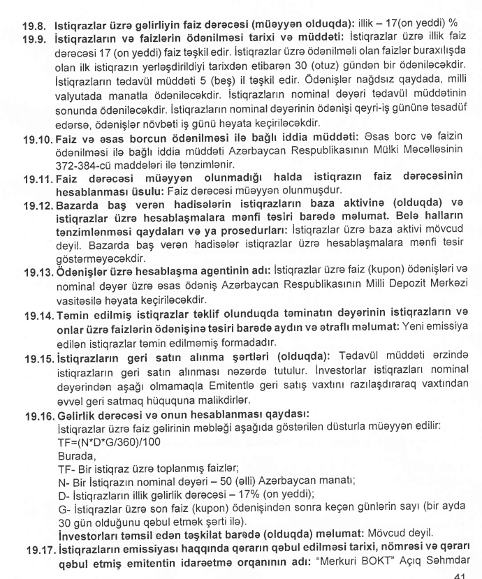 Merkuri-BOKT istiqraz-buraxılışı korporativ-istiqrazlar borc-alətləri kapital-cəlbi qiymətli-kağızlar faizli-istiqrazlar adlı-istiqrazlar sənədsiz-istiqrazlar təmin-edilməmiş-istiqrazlar illik-17-faiz-gəlirlilik 5-il-müddətli-istiqrazlar aylıq-faiz-ödənişi 50-manat-nominal-dəyər 22-min-istiqraz 1.1-milyon-manat-cəlb bank-olmayan-kredit-təşkilatı lizinq-xidmətləri lombard-krediti istehlak-kreditləri aqro-kreditlər investisiya-alətləri borc-bazarı Səbuhi-Əzizov Məmməd-Məmmədov