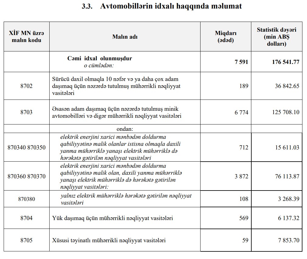 Beləliklə, Azərbaycana avtomobil idxalı dəyər ifadəsilə 37 milyon 55 min dollar və ya 27% artıb, say ifadəsilə 72 ədəd və ya 0,9% azalıb.