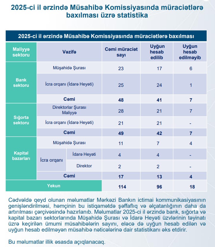 Statistikada qeyd olunan məlumatlar 2025-ci il ərzində bank, sığorta və kapital bazarı sektorlarında Müşahidə Şurası və İdarə Heyəti üzvlərinin təyinatı üzrə keçirilən ümumi müsahibələrin sayını, eləcə də uyğun hesab edilən və uyğun hesab edilməyən müsahibə nəticələrinə dair statistikanı əks etdirir. Bu məlumatların illik əsasda açıqlanması nəzərdə tutulub.
