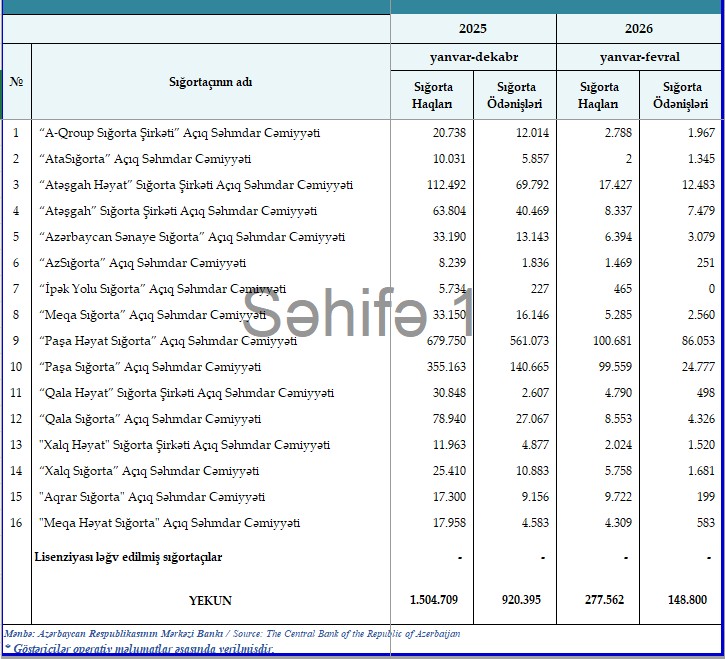 Müqayisə üçün qeyd edək ki, 2025-ci ilin ilk 2 ayı ərzində (yanvar-fevral) Azərbaycanda fəaliyyət göstərərn 16 sığorta şirkəti vasitəsilə 281 milyon 206 min manat sığorta haqları hesablanmış, 108 milyon 595 min manat sığorta ödənişləri həyata keçirilmişdi.